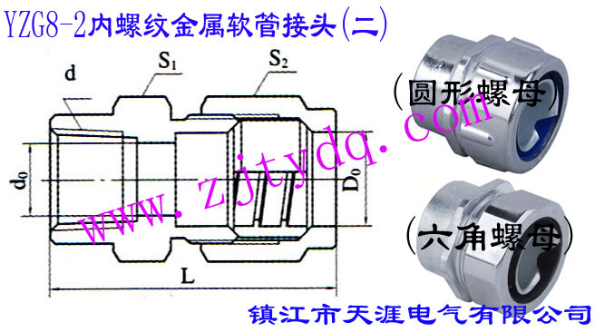 YZG8-2內螺紋分別為英制管螺紋ZG1/2"、ZG3/4"、ZG1"和ZG1 1/2"四種螺紋,與其相配的金屬軟管分別為DN13,DN17,DN21和DN31四種。YZG8-2內螺紋金屬軟管接頭(二)通常是和保護管相連接的。